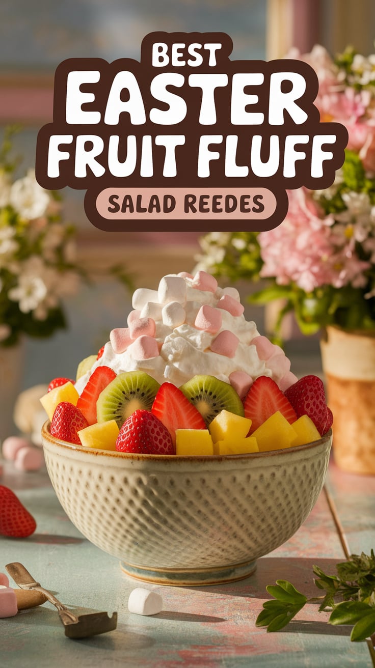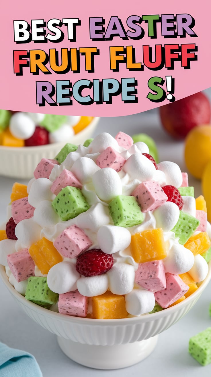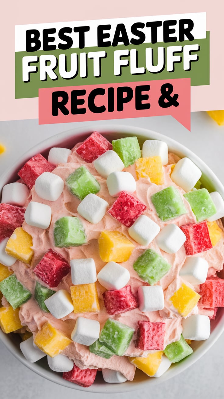 “Celebrate spring with this creamy, colorful Easter Fruit Fluff Salad — a quick 10-minute dessert made with marshmallows, whipped topping, and fruit. Perfect for family gatherings and Easter brunches! #EasterRecipes #FruitFluffSalad #DessertIdeas”